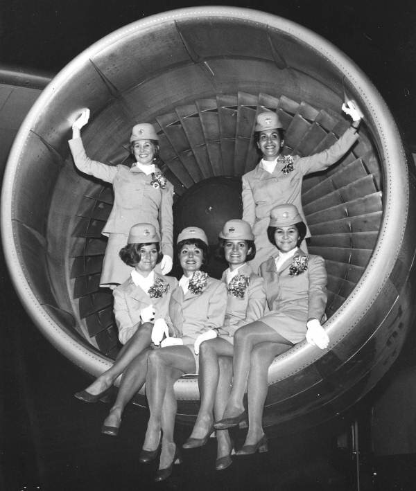 Hoy es día de vuelo. Estas azafatas de Pan Am posaron dentro de la turbina para esta foto: