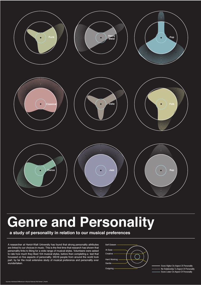 Fijaros en esta infografía de cómo diferentes géneros musicales se corresponden con nuestra personalidad siguiendo el estudio de la Universidad de Heriot-Watt: