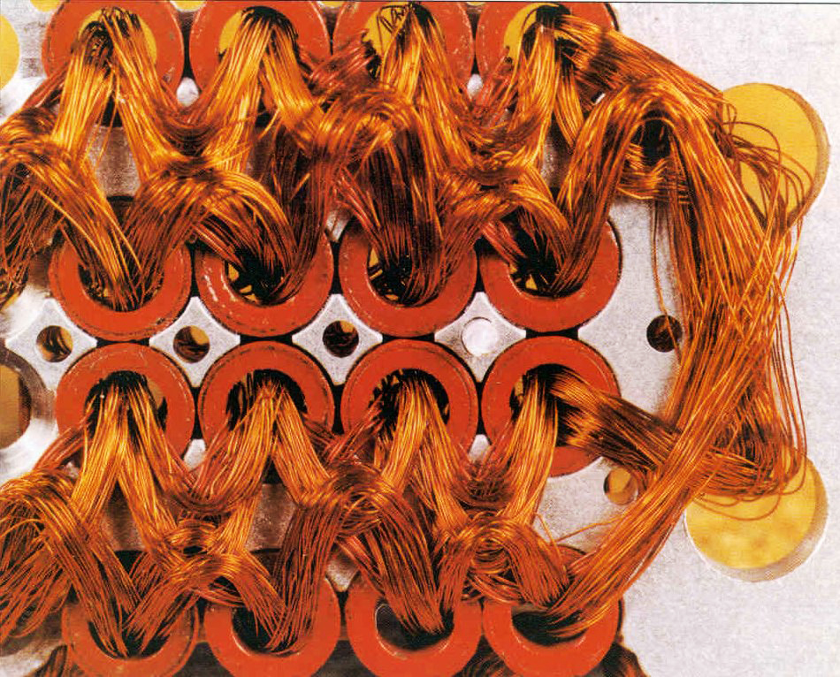 Una vez el código era sólido, se enviaba a unas instalaciones en Raytheon, donde un grupo de mujeres expertas, conocidas como «Las Pequeñas Mujeres Mayores», cableaban cables de cobre a través de anillos magnéticos (un cable que atravesaba un núcleo era un 1, un cable que iba alrededor de un núcleo era un 0). Olvidaros de la memoria RAM o las unidades de disco; en el Apolo la memoria estaba literalmente cableada y era literalmente indestructible.
