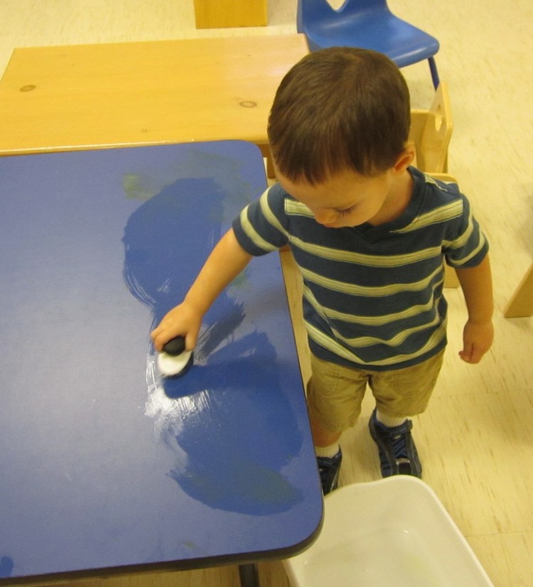 Limpiar una mesa con un paño, agua y jabón aburre a un adulto, ¡pero excita a un niño de dos años y medio! Es un reto. Haciéndolo, aprende a secuenciar actos, y hacerlo mejor cada día le proporciona autoestima.