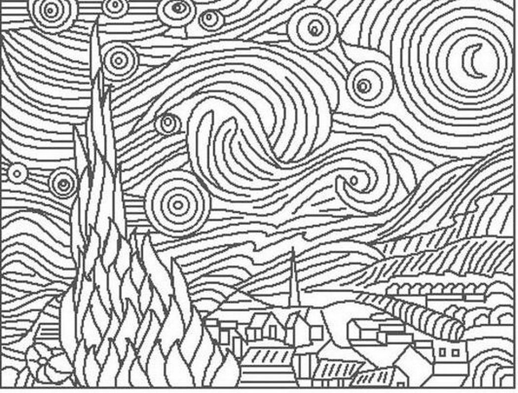 Una de las últimas cosas que hizo Vincent fue pintar la «Noche Estrellada«. A continuación os dejo algunas láminas que podemos utilizar para colorear como la original.