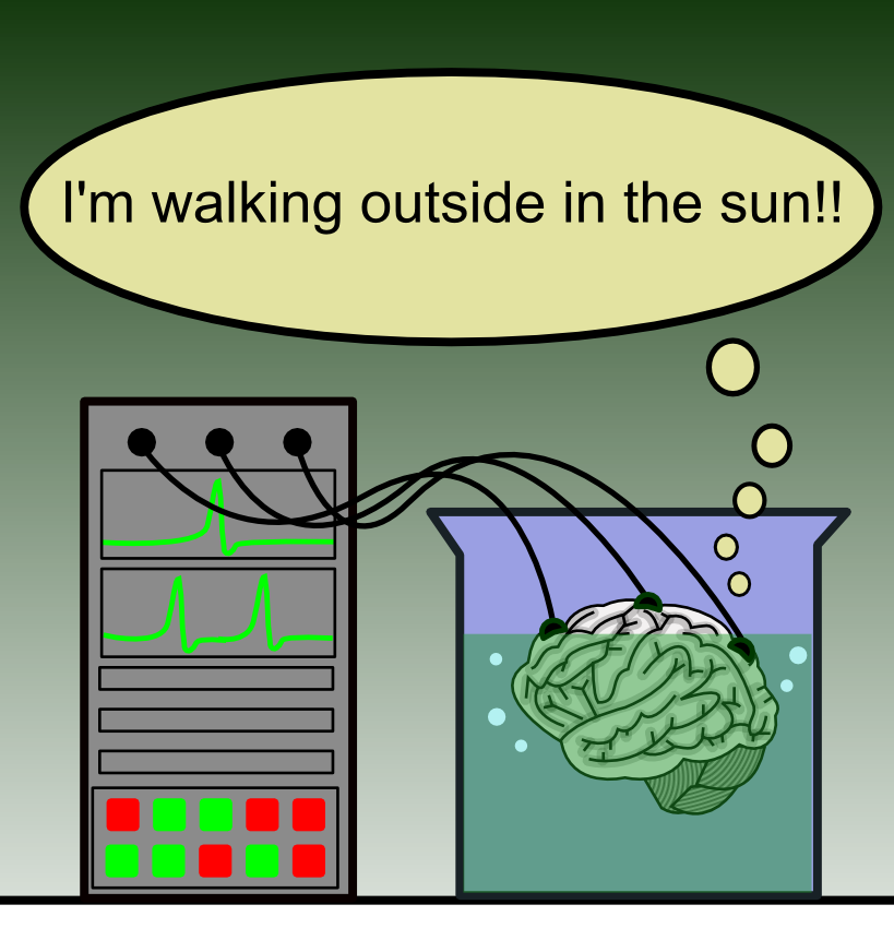 Si la única cosa de la que no dudamos es que podemos dudar, lo único que tenemos garantizado en esencia es que estamos dotados de un mecanismo de duda. Sin cuerpo. Podríamos ser cerebros aislados, siendo manipulados por cosas desconocidas y nuestro mundo un espejismo total.