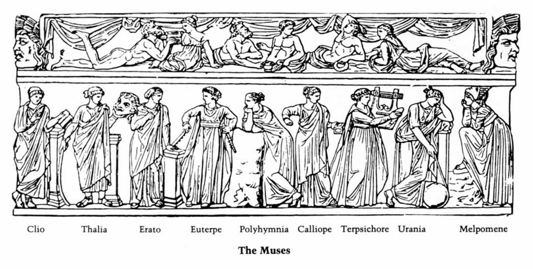 Por un lado, las musas griegas. Una musa es en la mitología griega, una divinidad inspiradora de la música y, según las nociones posteriores, divinidad que presidía los diferentes tipos de poesía.
