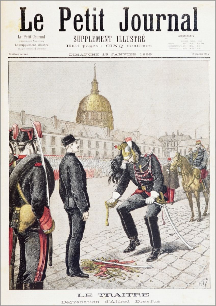 El caso se llevó a los tribunales, y se halló a Dreyfus culpable. Luego, los oficiales lo llevaron a una plaza pública; ritualmente le arrancaron la insignia de su uniforme y rompieron su espada en dos. Esto se llamó la Degradación de Dreyfus.