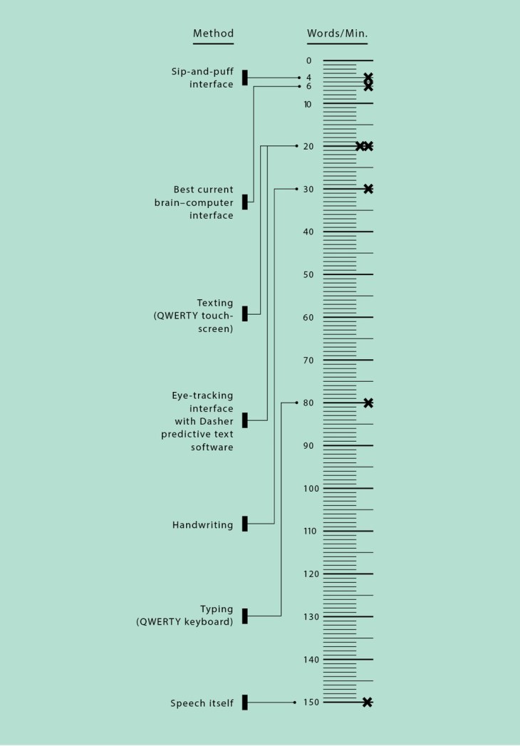 Sí, es posible comunicarse directamente a través de nuestras ondas cerebrales. Pero es extremadamente lento. Otros sustitutos del habla hacen el trabajo más rápido, como podemos ver en el gráfico. En la columna de la izquierda está el método usado y en la de la derecha las palabras por minuto que ofrece.