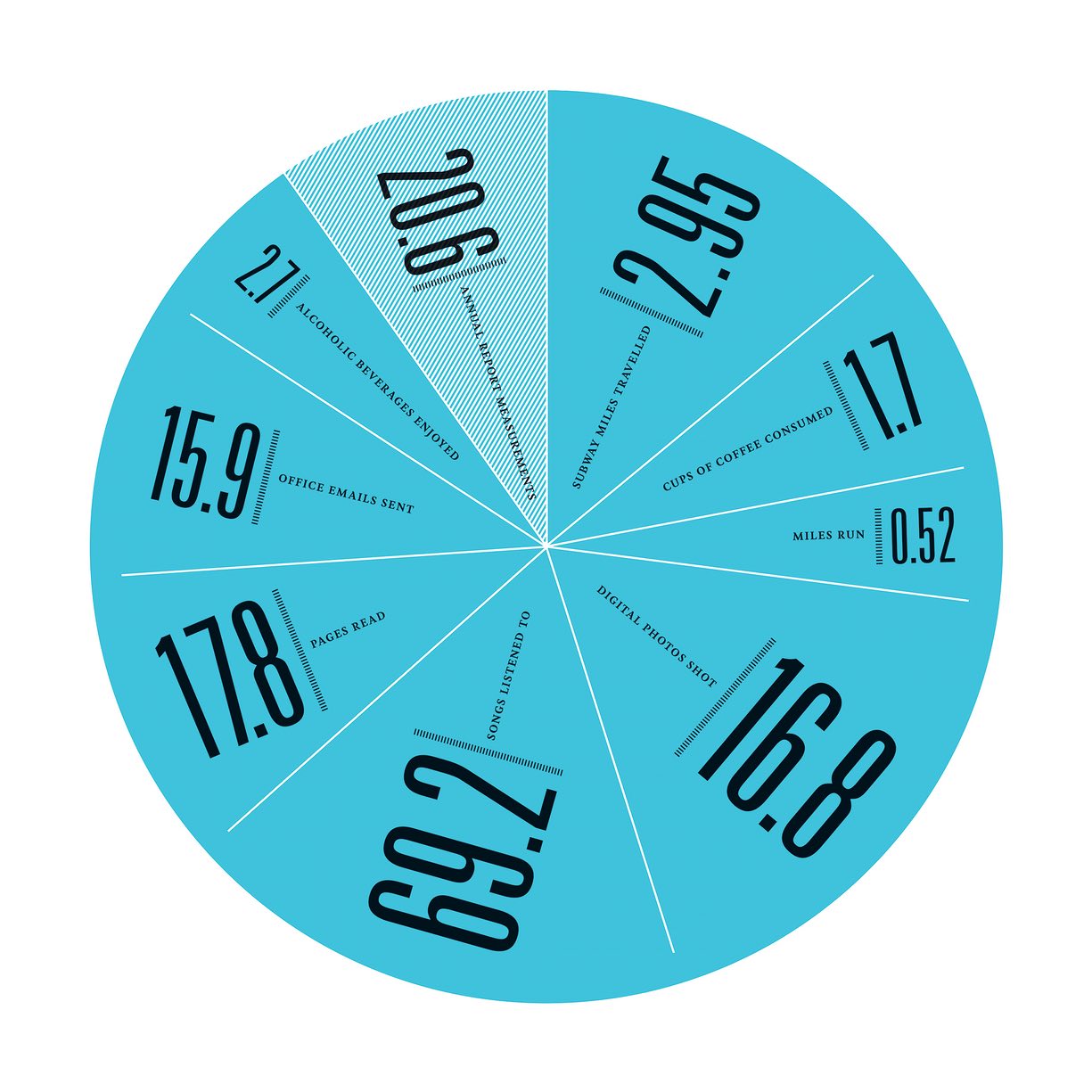 Gráfico de pastel que nos muestra las estadísticas de la media de un día del autor Nicholas Felton en la que incluye datos como el número de correos enviados o la cantidad de tazas de café consumidas.