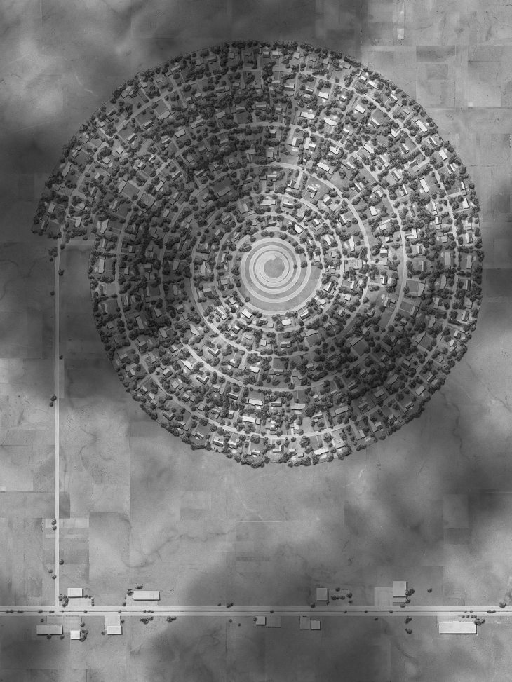 Diseño digital de Ross Racine, en el que se muestra un panorama urbano imaginario construido en espiral.