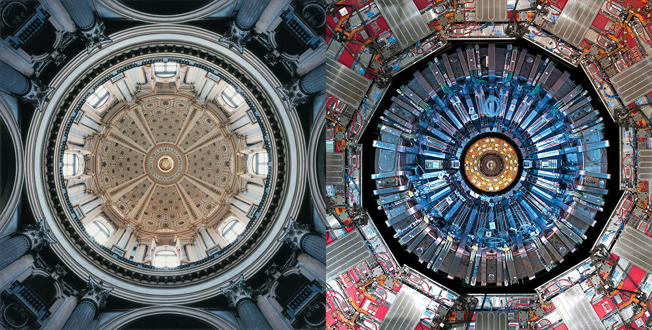 Estas lecciones de historia son más interesantes cuando juxtapone las imágenes circulares de eras, lugares y contextos totalmente dispares, en un único ejemplo. En una de ellas una imagen de la cúpula de la Basílica de Superga en Turín, se pone de lado con una fotografía de un Solenoide Compacto Muon (no se como traducirlo 😦 ), un instrumento cientéfico que detecta las partículas que participan en las colisiones a alta velocidad de los protones en el acelerador de partículas.