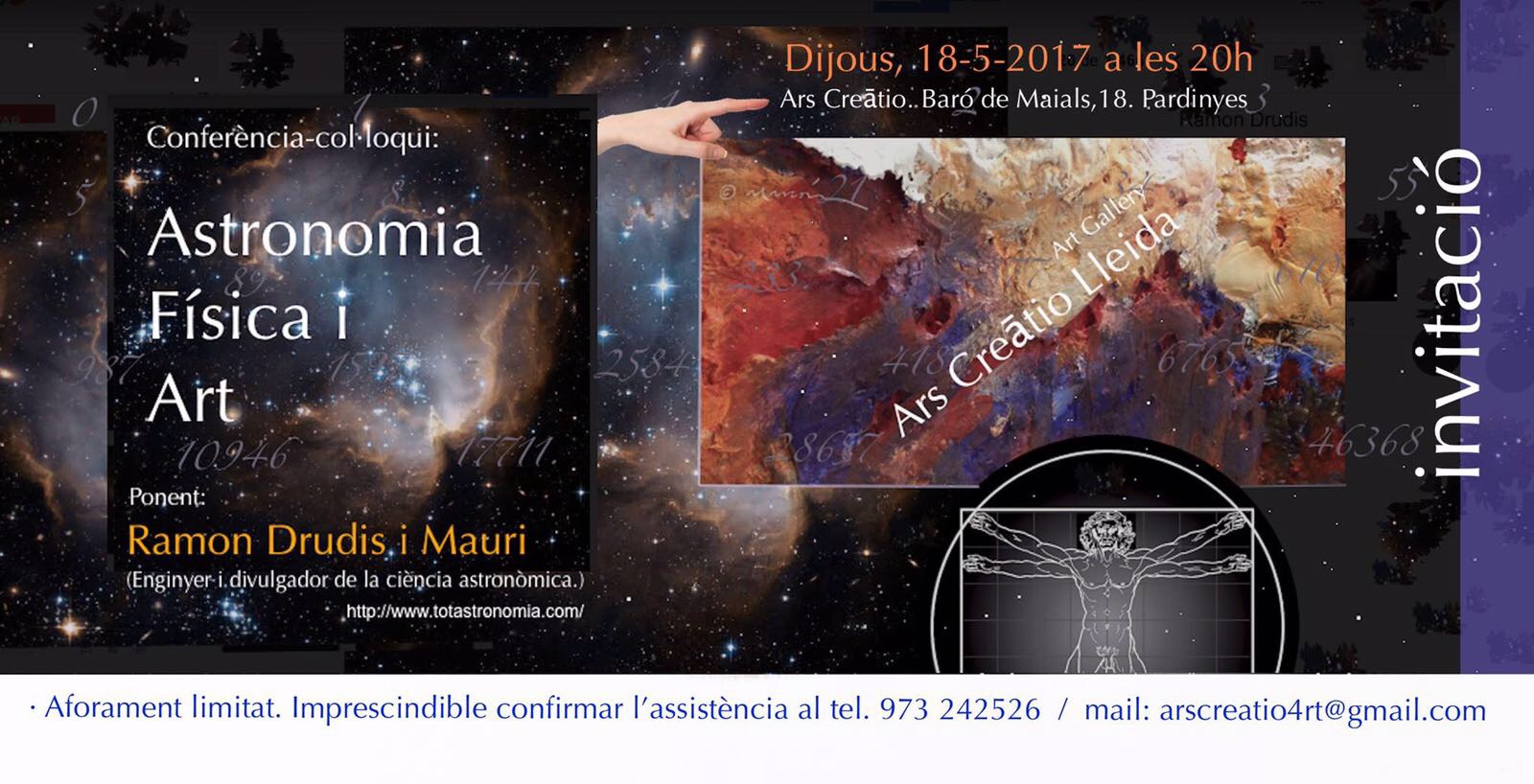 Bien, hoy es la segunda sesión de «Ágora», en este caso será una conferencia-coloquio titulada «Astronomía, Física y Arte» de mano de Ramon Drudis i Mauri; Ingeniero y Divulgador de la Ciencia Astronómica cuya web es: http://www.totastronomia.com, esta es la invitación a la sesión:
