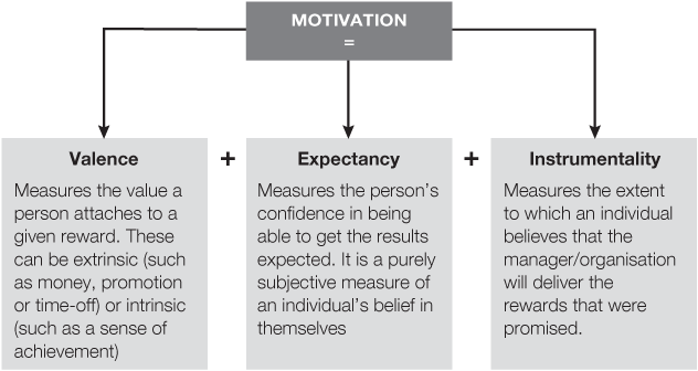 La expectativa es tener las herramientas o aptitudes correctas. La instrumentalidad es el claro entendimiento de la relación entre el rendimiento y los resultados. El valor es la importancia que el individuo da al resultado esperado.