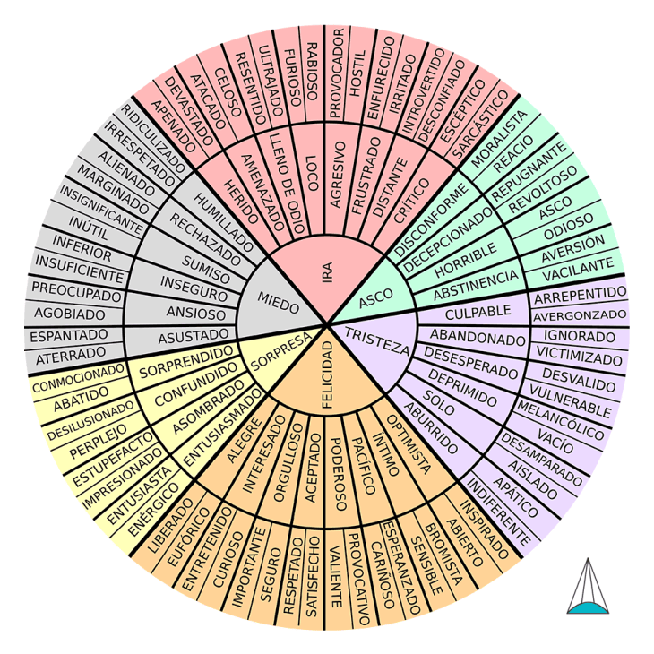 Empieza la frase con: «Me siento…»; luego elige una de las 4 emociones básicas: triste, asustad@, feliz, raibios@. Caterina simplificó la lista al conjunto más pequeño después de hacer un poco de investigación. Afirma que no hay ninguna necesidad de sofisticación. Que estas 4 emociones te cubrirán la mayoría de las veces.