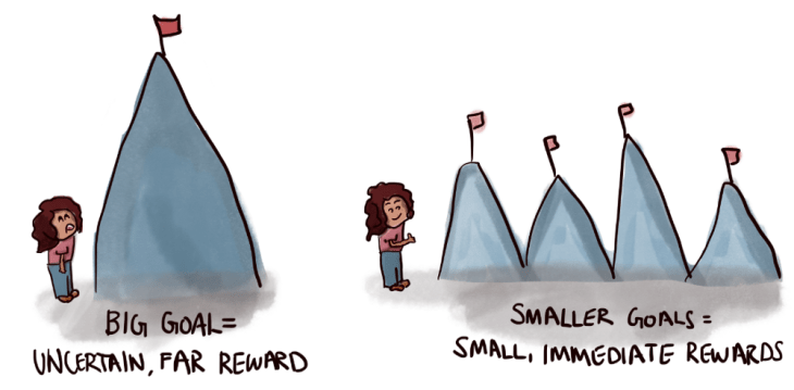 Te pones grandes y elevadas metas ya que te reditan recompensas masivas, ¿no?. Pues no tanto. Los grandes objetivos, como aprender Inglés o perder 20 quilos, toman mucho tiempo de alcanzar y son susceptibles de caer en el tipo de recompensas lejanas por culpa del hyperbolic discounting.