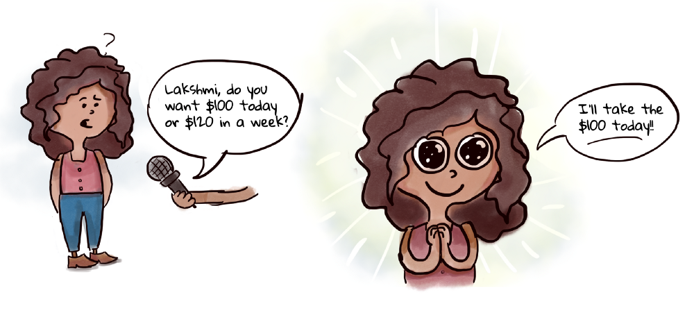 L@s investigador@s llevaron a cabo un experimento clásico que ilustra el fenómeno. Imagina que te dan a escoger entre: ganar 100€ hoy o 120€ en una semana. Así es cómo la mayoría de personas eligen: