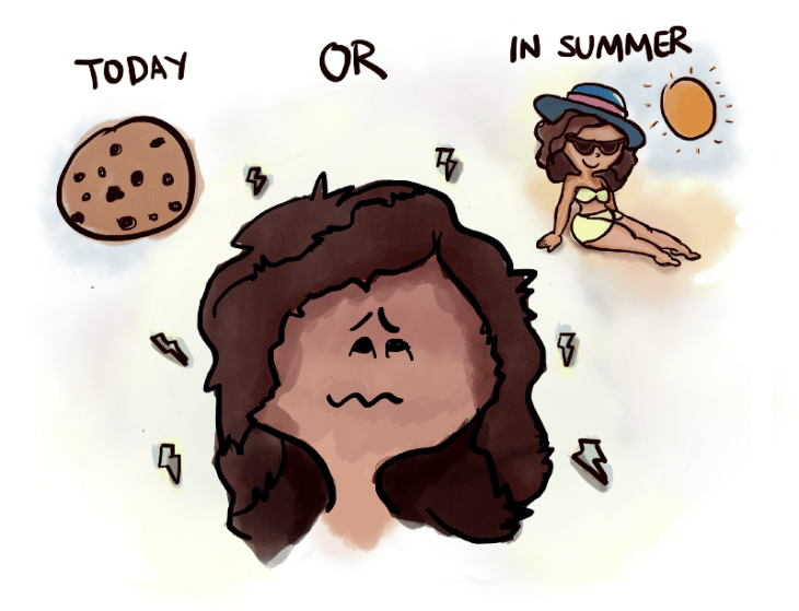 Desafortunadamente, las elecciones que tenemos que tomar en el día a día no son tan claras ni pueden compararse tan fácilmente. Pongamos que te vas de vacaciones en unos meses. ¿Cómo eliges entre disfrutar de una galleta ahora mismo en contraposición a tener un cuerpo serrano en la playa?