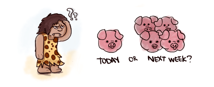 Bajo condiciones de vida severas, no sabíamos si íbamos a sobrevivir hasta el final del día, así que nuestra especie evolucionó eligiendo la opción más inmediata que incrementaba en mucho la oportunidad de pasar nuestros genes. Nuestros cerebros están cableados para escoger cosas inmediatas y seguras antes que una gran recompensa potencial en el futuro.