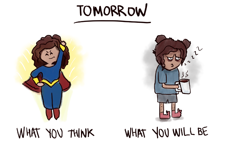 Antes de retrasar algo, piensa en tu estado mental futuro, como de cansad@, desgastad@ y somnolient@ vas a estar. Evaluar conscientemente la fiabilidad del futuro te puede servir como motivación para hacer hoy las cosas que quieres hacer.