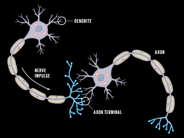 Cada neurona recibe las señales entrantes a través de estructuras en rama llamadas dendritas y dan su respuesta de salida a través de su largo axón. Si la combinación de señales entrantes hace que el voltaje de la neurona supere cierto umbral, se abren los canales iónicos que están situados a lo largo de todo el axón. En este video podemos ser ‘el impulso nervioso’ a través del axón: