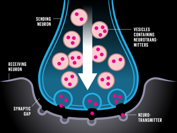 En la mayoría de las neuronas, este potencial de acción dispara la liberación de unos productos químicos, llamados neurotransmisores, al espacio sináptico o sinápsis. Estas moléculas activan los receptores en las células conectadas e influencian a las neuronas receptoras en un modo de activación o de inhibición.