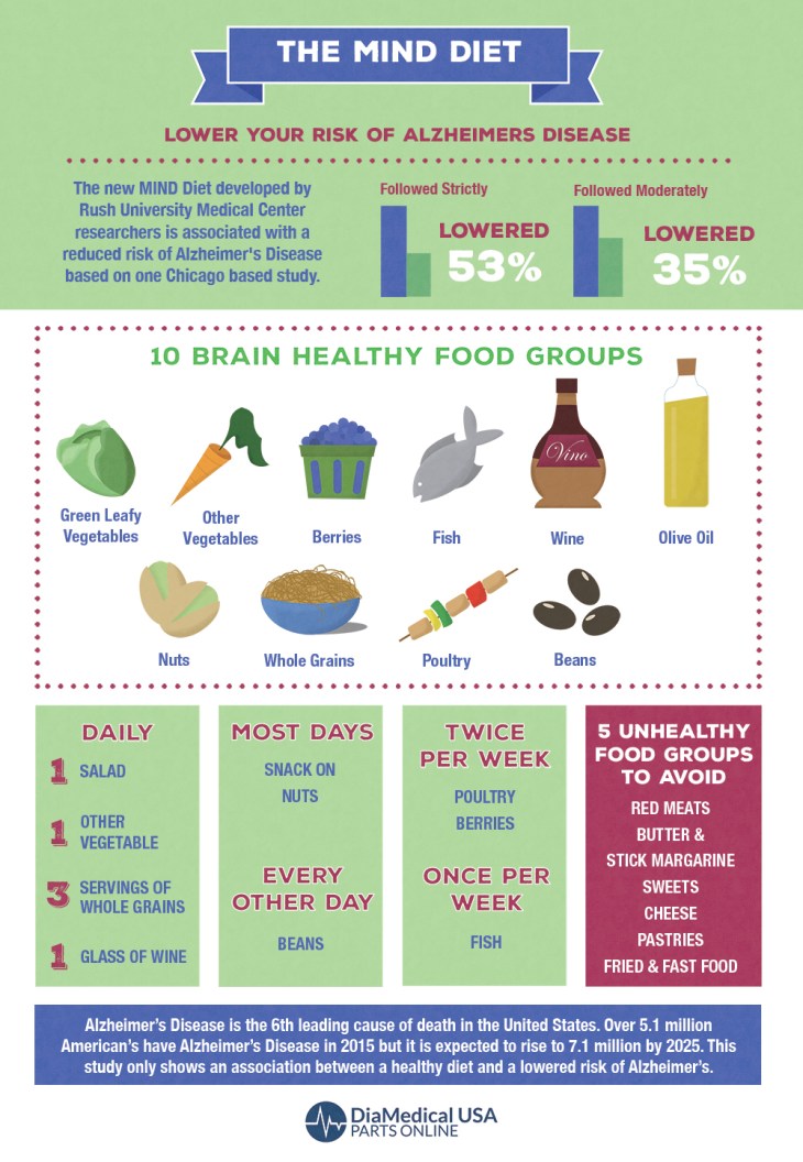 La dieta MIND recomienda el alto consumo de 10 grupos de comida «saludable para el cerebro» como: verdura, frutos secos, bayas y pescado. Limita (que no prohíbe) el consumo de comida no saludable cómo las carnes rojas, la mantequilla y la margarina, el queso, los dulces y la comida procesada. Los hallazgos revelaron que los adultos más viejos que se ciñeron a la dieta tenían un 53% menos de riesgo de sufrir Alzheimer, y aquell@s que la siguieron moderadamente lo vieron reducido un 35%.