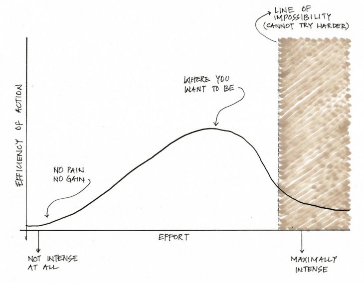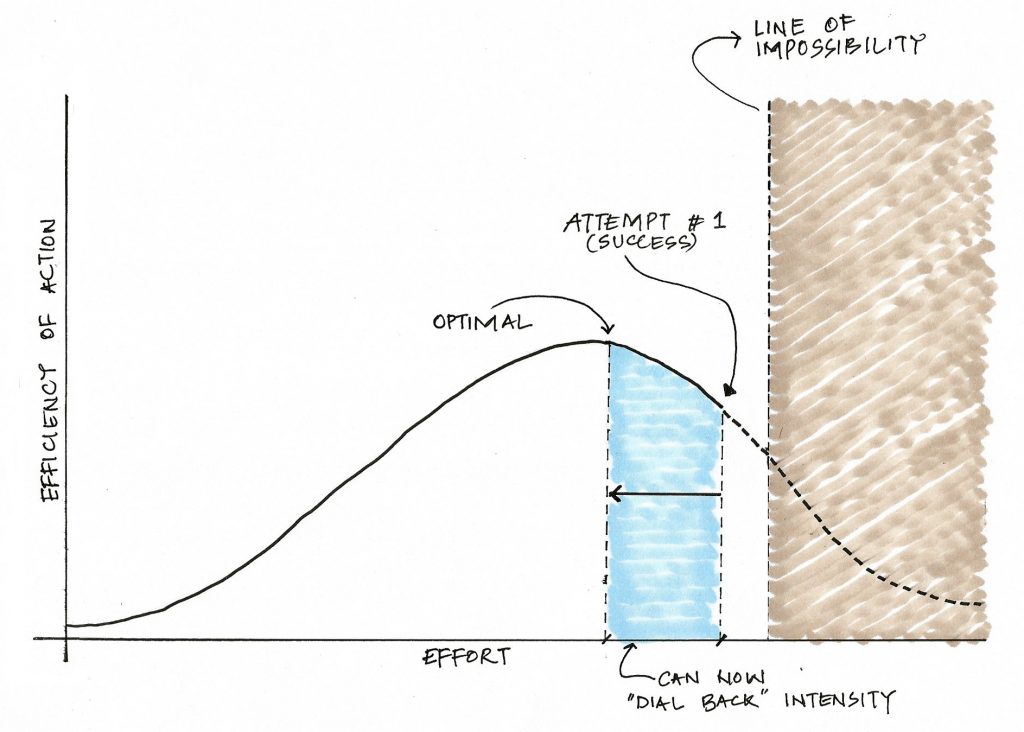 Para alcanzar resultados en cualquier meta, hay un rango óptimo de esfuerzo. Demasiado poco esfuerzo y fallarás al ganar terreno. A veces, si hay alguna fricción entre donde estás ahora y tu meta, no harás ningún esfuerzo. Incluso cuando ese no sea el caso, el progreso será tan lento que será poco estimulante o inaceptable.