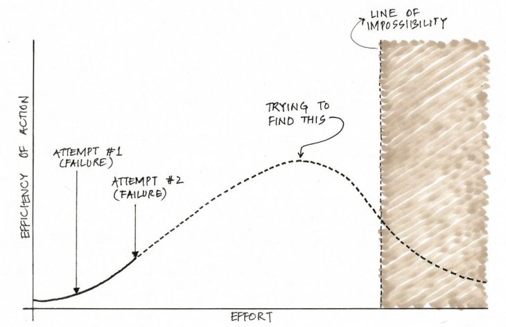 Comparemos esto con empezar siendo más radicales. Si lo hacemos de este modo, lo más probable es que el umbral de esfuerzo esté ya dentro de nuestros planes. Y, como muestra la siguiente figura, nos pasemos de la raya a la primera. En este caso deberemos hacer lo contrario, regular nuestros esfuerzos (hacia abajo) en base a un éxito abrumador. Además, en comparación a ir fallando, esto es más fácil de hacer.