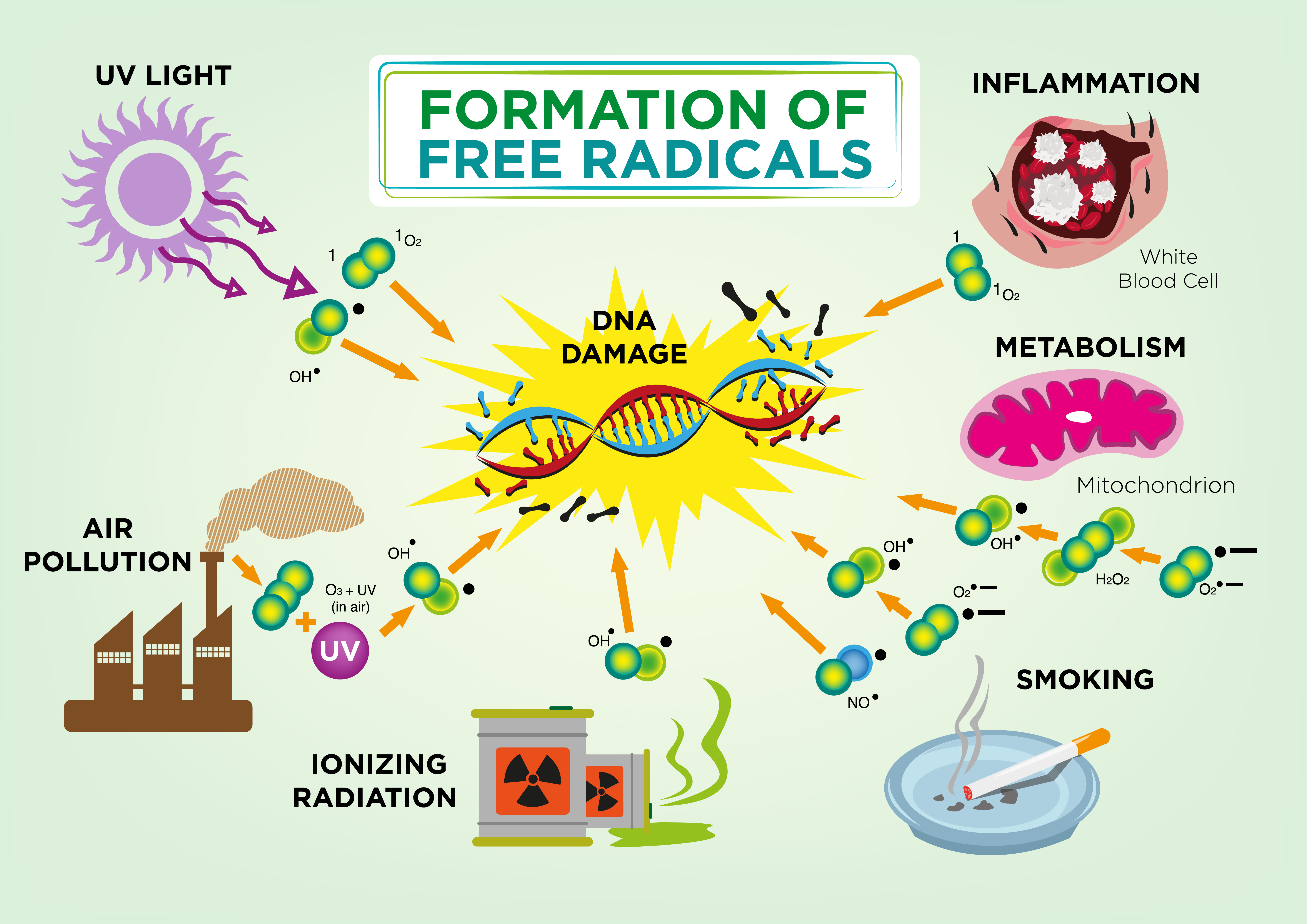 Para entender el estrés oxidativo, primero tenemos que entender los radicales libres. Éstos son moléculas dañinas que encontramos dentro del cuerpo y que son un subproducto de algunos procesos metabólicos. Estas moléculas cargadas de oxígeno tienen uno o más electrones sin aparejar. Los antioxidantes neutralizan a los radicales libres, razón por la que es importante incluirlos en nuestra dieta. El aumento de radicales libres conduce al estrés oxidativo, que a su vez puede dañar al cuerpo.