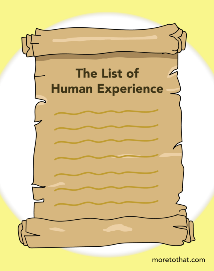Esta es la Lista de la Experiencia Humana, y cada un@ de de nosotr@s tiene su propia versión de ella. Es el libro mayor de nuestra existencia, el documento maestro que sigue todo lo que nos puede dar potencialmente cualquier experiencia en cualquier momento.