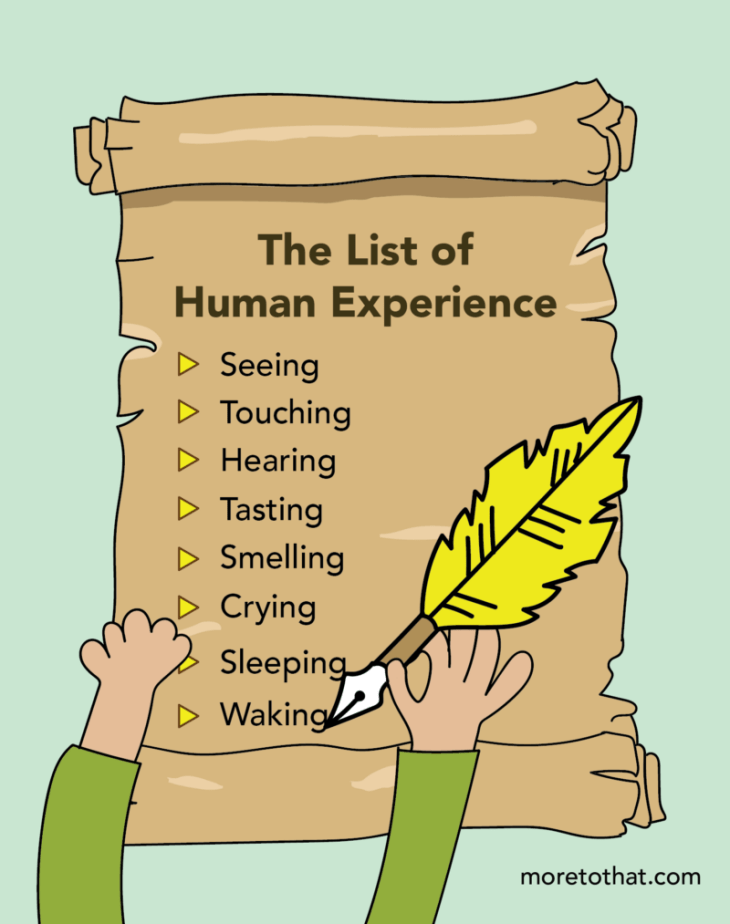 Por ejemplo, si eres lo suficientemente afortunad@ como para nacer sin ninguna discapacidad congénita y puedes tener acceso a todos tus sentidos, la Vida estará realmente ocupada grabando al momento, todas las cosas que puedes hacer y todos los modos en los que puedes experimentar esas cosas: