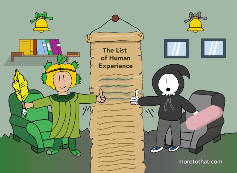 Lo mejor de la Vida y la Muerte es la comunicación activa que tienen mientras trabajan juntas en crear el balance en la Lista de la Experiencia Humana. Cuando la Muerte borra una experiencia particular, le da a la Vida una oportunidad de añadir una nueva perspectiva.