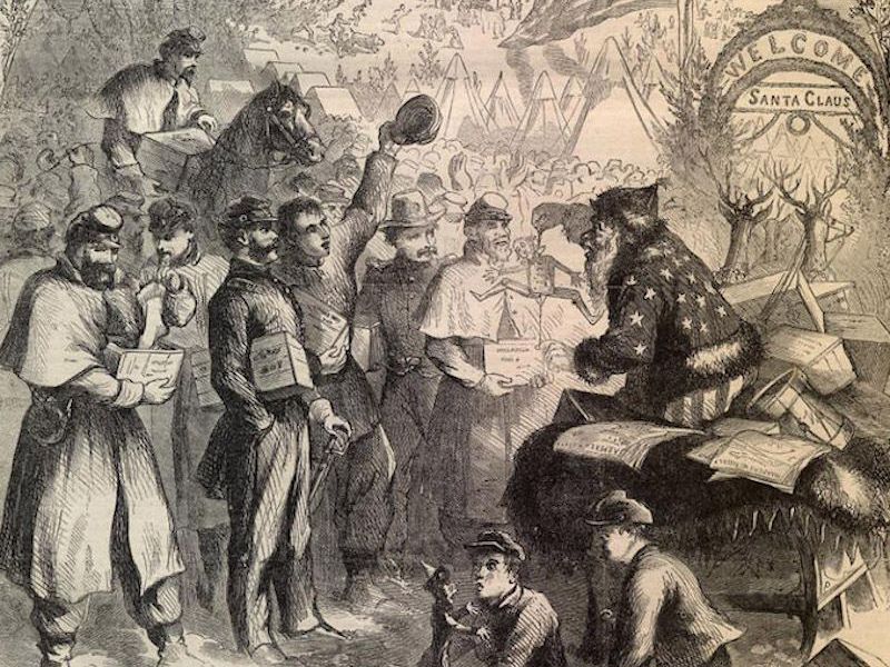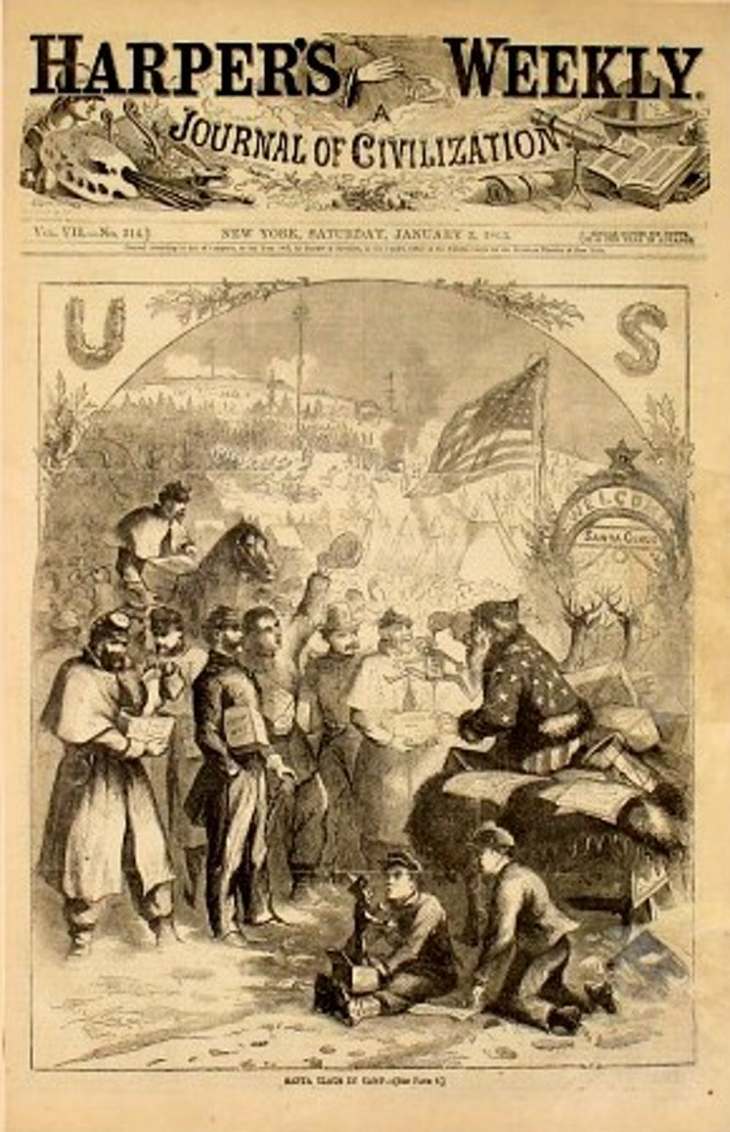 El 3 de Enero de 1863, en la revista ilustrada Harper’s Weekly, aparecieron dos imágenes que cimentaron la obsesión de los EEUU con un elfo viejo y alegre. El primer dibujo muestra a Santa dando regalos en un campamento del Ejército de la Unión. Para que ningún@ lector@ cuestionase la lealtad de Santa con la Guerra Civil, llevaba una chaqueta con un patrón de estrellas y unos pantalones a rayas. En sus manos sostiene un títere con una cuerda alrededor de su cuello, las características del muñeco eran similares a las del presidente Confederado, Jefferson Davis.