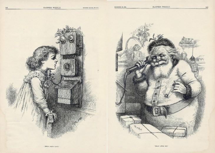Fue este el mundo que se encontró Thomas Nast al llegar allá por 1850. Haciendo sus primeros dibujos en su adolescencia, se convirtió en un ilustrador en plantilla de Harper’s Weekly, una de las revistas más populares en 1862. La revista no era tan sólo para servir a serios propósitos: «Daba noticias políticas y comentaba eventos nacionales e internacionales, pero también ofrecía ficción sentimental, humor y noticias culturales». ¿Qué mejor sitio para Nast para llevar a la vida su meticulosamente detallada imagen de Santa?, de modo que empezando con los dibujos de Enero de 1863, Nast empezó a inmortalizar la mítica figura de Santa Claus.