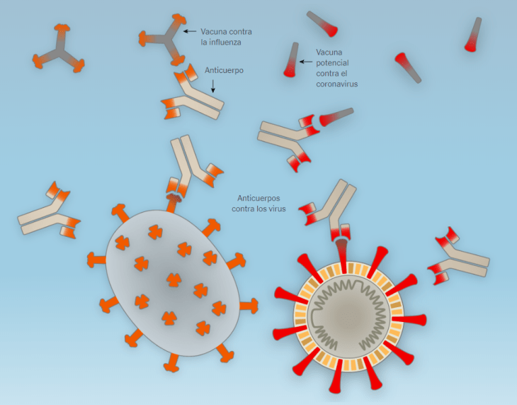 Una vacuna futura podría ayudar a que el cuerpo produzca anticuerpos contra el virus SARS-CoV-2 e impida que infecte las células humanas. La vacuna contra la gripe funciona de manera similar, pero los anticuerpos que se generan de la vacuna contra la gripe no protegen contra el coronavirus.