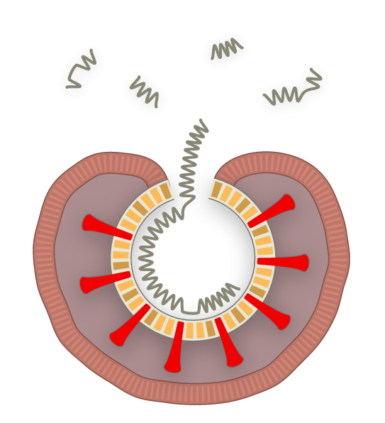 El genoma del virus tiene menos de 30.000 “letras” genéticas de longitud. (El nuestro, por ejemplo, tiene 3000 millones). La célula infectada lee el ARN y empieza a producir proteínas que mantienen al sistema inmunitario al margen y ayudan a crear nuevas copias del virus.