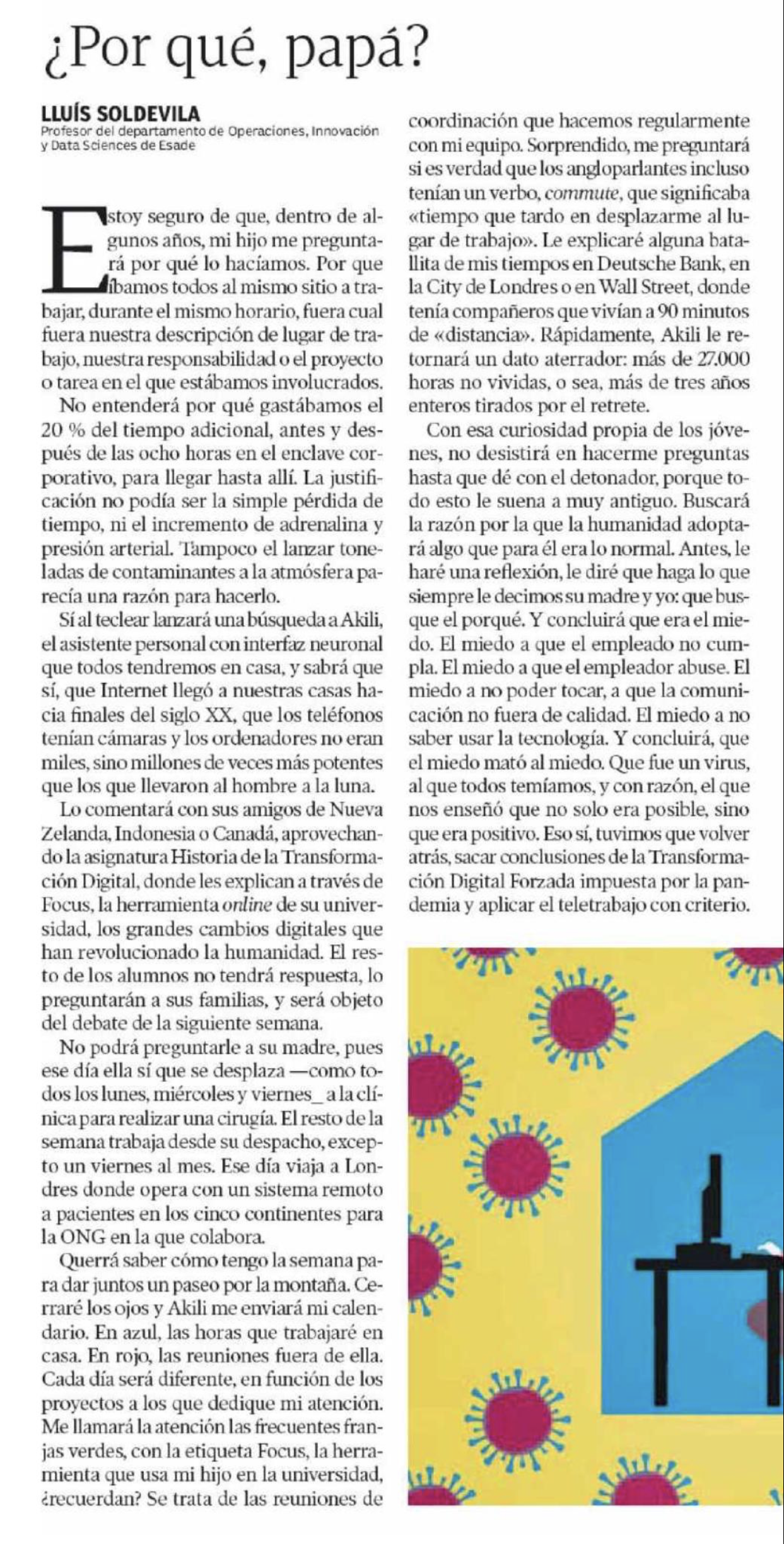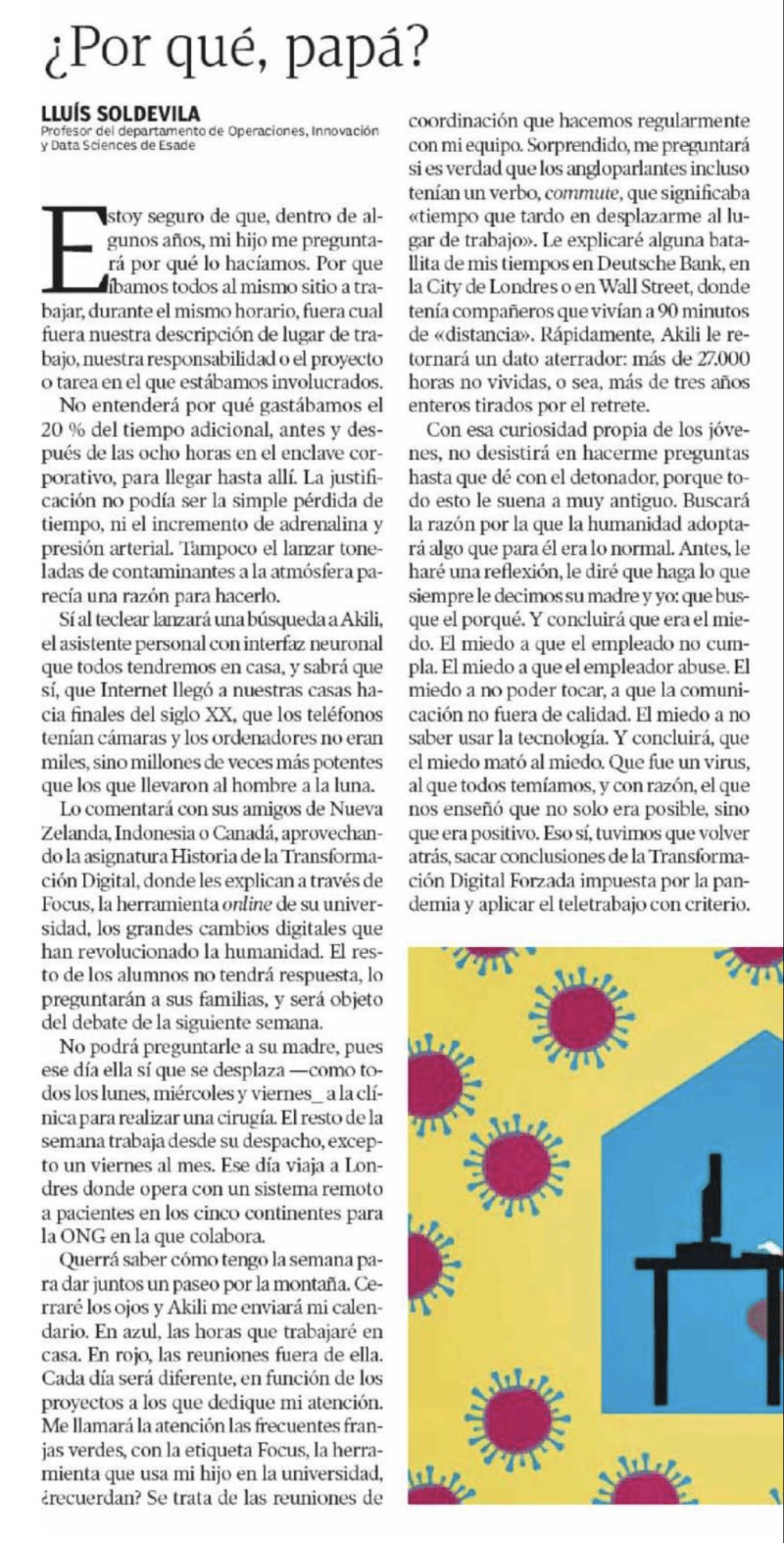 Quiero compartir con vosotr@s un artículo, más que un artículo, un cuento con moraleja, escrito por Lluís Soldevila, Profesor del Departamento de Operaciones, Innovación y Data Sciences de Esade, publicado en «La Voz de Galicia» el paso 17 de Mayo de 2020.