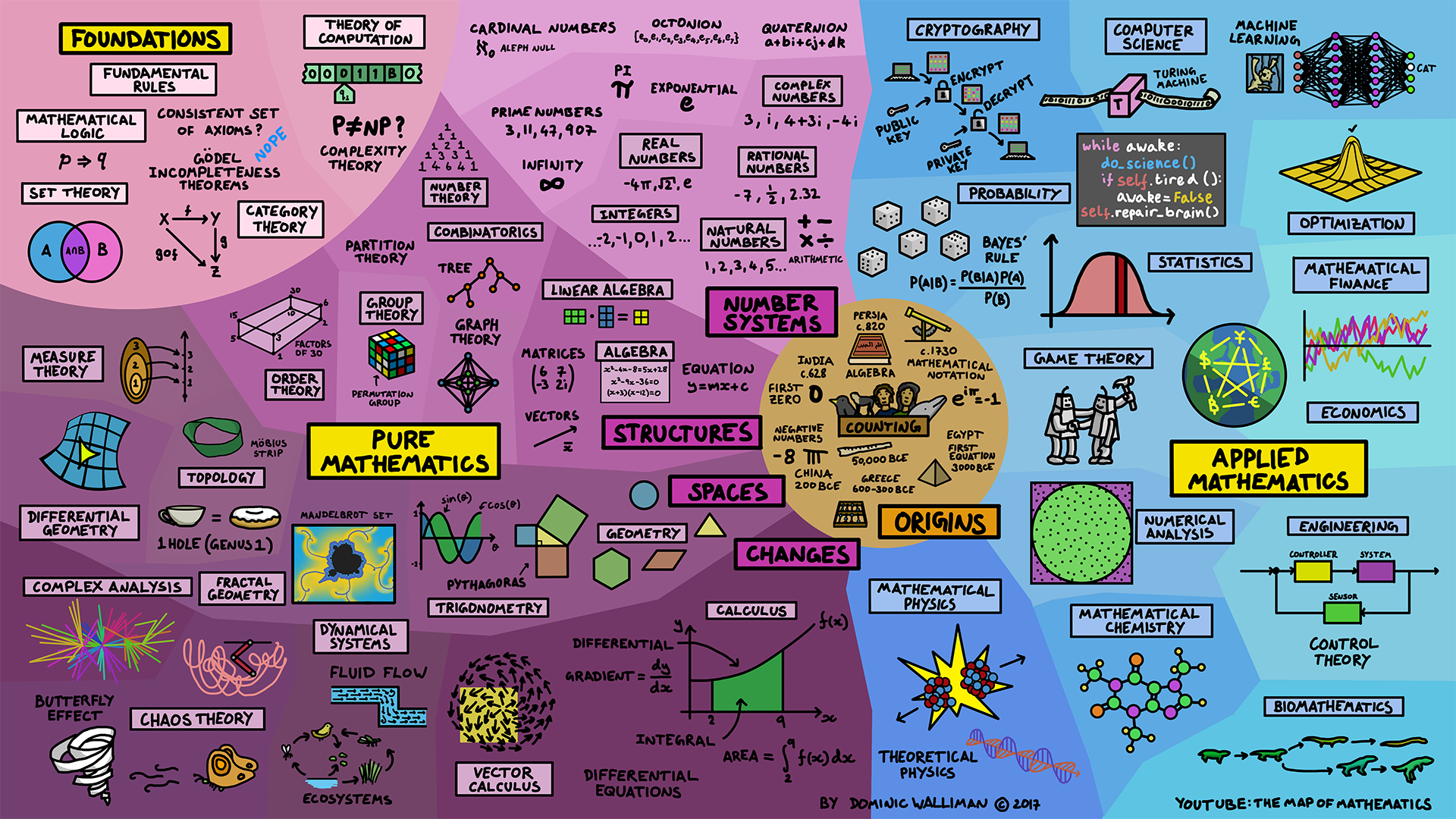 Buscando una imagen de suficiente calidad y tamaño para poderla ver bien y poderla utilizar en este Brain Feeling, descubrí un vídeo de Youtube en el que se va explicando la historia de esta maravillosa (pero mal afamada) ciencia a medida que se va construyendo la imagen. Este es el vídeo de la historia de las matemáticas a medida que se construye este mapa.