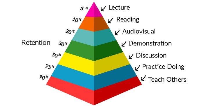 Fijaos en el siguiente gráfico, la pirámide de retención. En él podemos ver qué acción está asociada con que porcentaje de aprendizaje nos aporta: