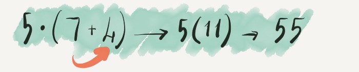 Entonces, lo que debemos hacer es recordar de multiplicar primero antes de sumar: