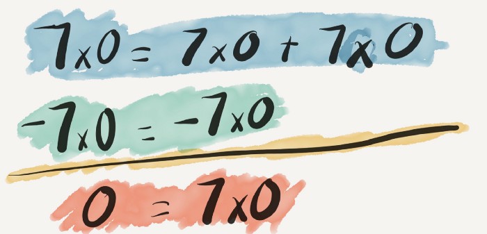 7x(0+0) será lo mismo que 7×0 + 7×0. Con lo que: 7×0 = 7×0 + 7×0