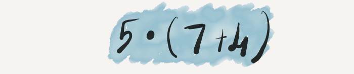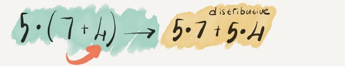 O bien, podemos multiplicar primero por «5» y distribuirlo con el «7» y el «4»: