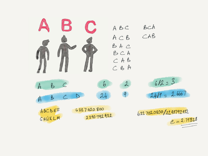 Saca todas las combinaciones de ordenar personas en una fila. Ahora divide el número de combinaciones con la condición extra de que no haya ninguna en orden alfabético. A medida que haces más y más combinaciones con más personas, el número se aproxima a e.