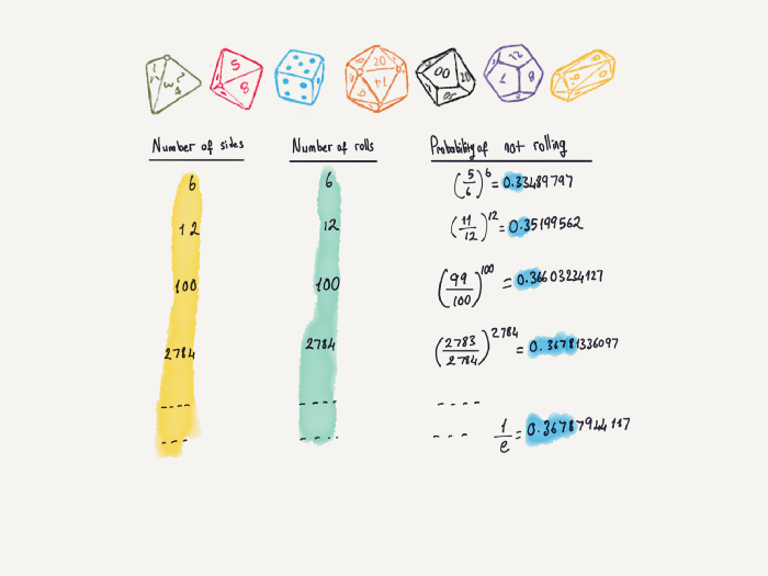 Otro ejemplo es cuando tienes un dado de 6 caras y lo tiras 6 veces, la probabilidad de no obtener un 6 es 0.33489797. Si tienes un dado de 12 caras y lo tiras 12 veces, la probabilidad de no obtener un 12 es 0.35199562. Intuitivamente podemos ver que la oportunidad se acerca cada vez más a e=0.36787944117…