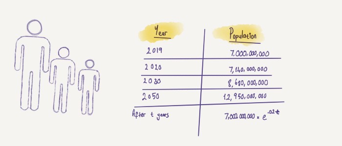 El planeta cada vez está más poblado y los directores han empezado a hacer películas sobre el aumento de la población. Ahora hay 7 billones (americanos) de personas en el mundo. Si nuestra población aumenta un 2% anualmente, en 2050, habrá casi 13 billones (americanos) de personas. Con lo que tenemos que la fórmula para la población en «t» años será e elevado al porcentaje anual multiplicado por el tiempo: